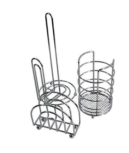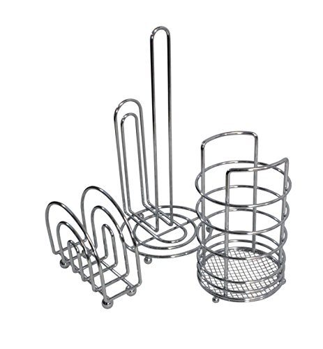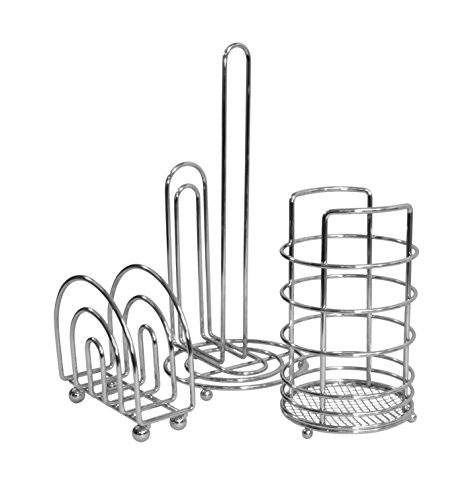 A chrome 3 piece organizer set to keep basic kitchen utensils and paper products within reach. Brings a bright clean look to your kitchen. Nice weight but not extremely heavy which is easy to move as needed. Hand wash only.