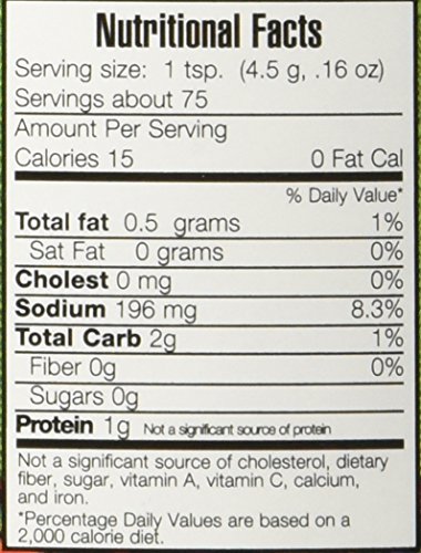 - Made in USA with more than 90% ingredients sourced in USA! 12oz jar = 75 Servings, 15 Calories per cup. (Sodium Content in 1 serving: 196mg)