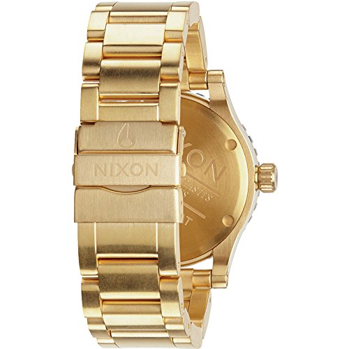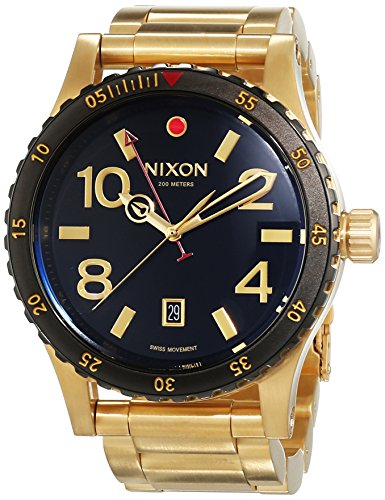 Nixon A277513 Diplomat SS men's GMT dive watch features a 45mm wide and 14mm thick yellow gold plated solid stainless steel case with a unidirectional rotating black bezel and a textured triple gasket screw down crown. Nixon A277513 is powered by a precise Swiss Made Ronda quartz GMT movement. This stylish watch also features a sharp looking black dial with gold tone luminous skeleton hands and index hour markers along with the GMT and date display functions, scratch resistant domed hardened mineral crystal and water resistant to 200 meters. Nixon A277513 is equipped with a 23mm wide yellow gold plated solid stainless steel bracelet with a fold over safety lock push button clasp. Nixon A277513 men's Diplomat SS black dial yellow gold steel bracelet dive watch is brand new and comes in an original Nixon gift box and is backed by a 2 years store warranty.