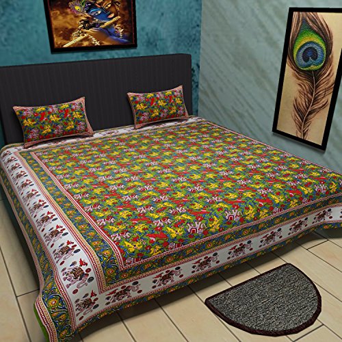 Traditional Mafia Wild Flower Pure Cotton Printed Double Bedsheet with 2 Pillow Covers, King, Green