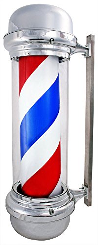 FEATURES: Red, white and blue barber pole. Wall mounted. Steel Mounting Base. Spinning swirl pattern cylinder. Instant recognition will draw in more clients. Inner LED light for night use. Chrome plated cap. Sturdy clear acrylic plastic covering. Light Switch. Cylinder switch.