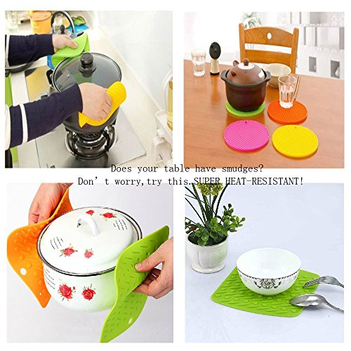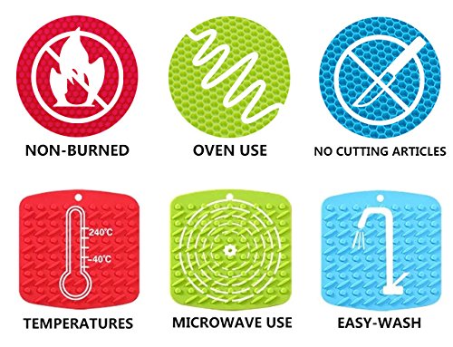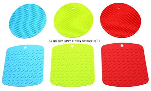 - Feature : FDA Approved Eco-Friendly Kitchen Accessories, Heat-resistant material to 500° F / Size: Round/Square Trivets - 18cm dia,8mm High,84g / 17.2 x 17.3cm,4.2mm High,84g / Round & Square Silicone Hot Pads / Trivets - SMART kitchen accessories & MORE choices privided for you, extra value you will never have! / Insulation performance, FLEXIBLE, non-slip, can be used as jar opener, spoon rest, trivet or garlic peeler, etc. / Roll up and store away or hang on hook, EASY to clean, durable Home Decor and PERFECT Display for home, wedding, party, and banquet.