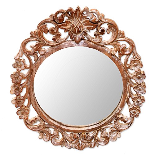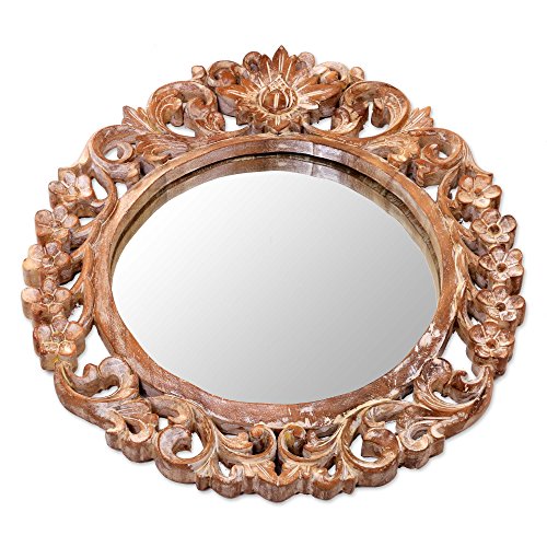 NOVICA Hand Carved Natural Suar Wood Floral Round Wall Mirror From Indonesia, Brown 'Gianyar Garden'