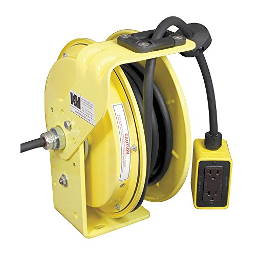 KH Industries RTB Series ReelTuff Industrial Grade Retractable Power Cord Reel with Black Cable, 12/3 SJOW Cable Prewired with Four Receptacle Outlet Box, 20 Amp, 50' Length, Yellow Powder Coat Finish
