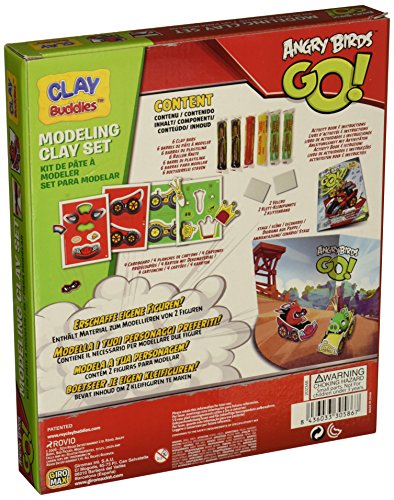 The Angry birds Clay Buddies are here! Your friends to mold have arrived. The real Angry birds Clay Buddies are now created with your own hands! Shape your favorite Angry Birds! You can shape, have fun and complete your collection with the Angry birds Clay Buddies Starter pack with 6 modelling clay bars a big storybook where the kids will play with their own clay licensed clay buddy. In the box you will have also a scene to put your figurines and materials to create and mold 2 figurines. Instructions and Velcro included to mold your figure.Feature