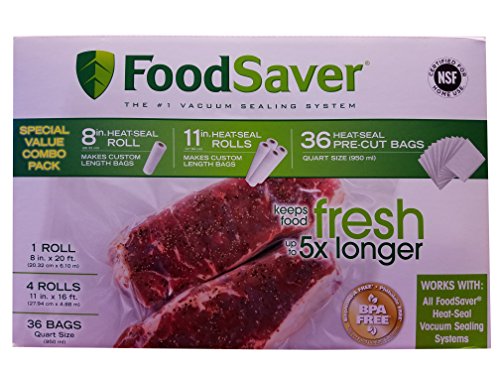 - Includes: 1 ea - 8 inch x 20 ft, Heat-seal Roll, 4 ea - 11 inch x 16 ft Heat-seal Roll, and 36 ea - 1- quart Heat-seal Pre-cut Bags.