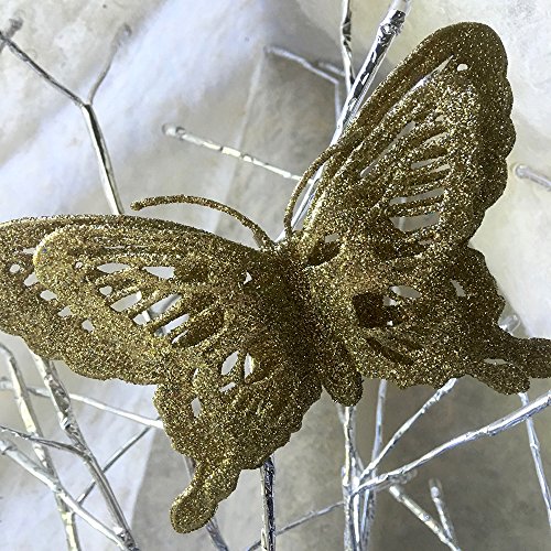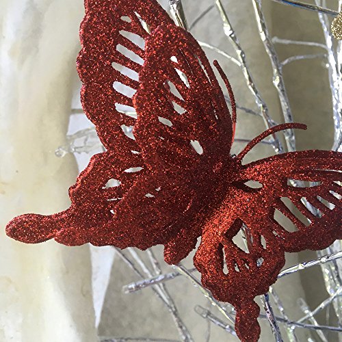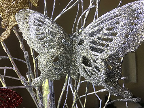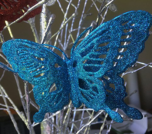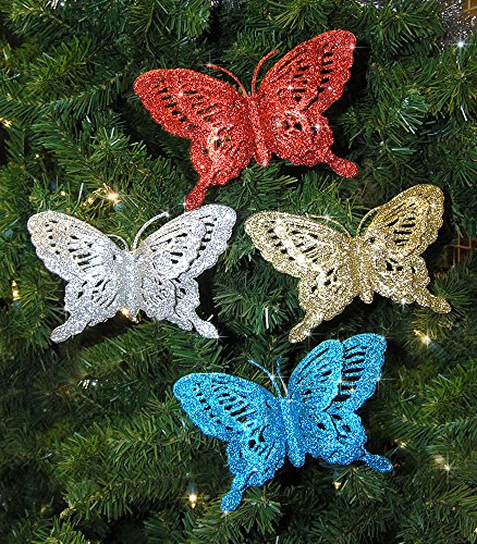 -. Feature : GLITTER BUTTERFLIES. Bright blue, red, silver and gold glittered butterfly ornaments. This pack of 12 comes with 3 of each color. These clip on ornaments are drenched in dazzling glitter layered to give a 3-D effect. / CLIP-ON BUTTERFLY ORNAMENTS. These are the most beautiful butterfly clip ons. Mix and match the colors in the set. Artificial butterflies are so fun to use on present toppers, DIY projects, crafts, wedding decorations or CHRISTMAS DECORATIONS. / SPARKLING BUTTERFLIES. They are made of a non-breakable, flexible material and fully covered from the top to the bottom of with glitter. Perfect for you butterfly theme home decor. Glitter Butterflies can be used as silk flower decorations, cake toppers, and party decorations and wedding ceremony. / NO ASSEMBLY REQUIRED. Each butterfly ornament comes ready to attach to anything because they already have the metal alligator clips. They would look beautiful on your Christmas tree, attached to your xmas garland or hanging in a window. / SIZE. Each butterfly is approx. 5 1/2" wide and 3 1/2" tall. They are just the right size for any size tree.