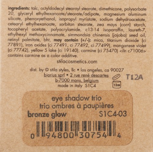 -. Binding : Health and Beauty -. Brand : stila -. Department : womens -. Feature : Designed to provide a cohesive look / Widens and illuminates with pearl powder / Sheer color never appears thick or chalky / Baked on terra cotta disks for a super velvety texture / Gold Glow features shades of bronze, mocha and creamy pink -. IsAdultProduct : 0 -. Label : stila -. Manufacturer : stila -. Model : S1C4-03 -. MPN : S1C4-03 -. NumberOfItems : 1 -. PartNumber : S1C4-03 -. ProductGroup : Prestige Beauty -. ProductTypeName : LUXURY_BEAUTY -. Publisher : stila -. ReleaseDate : 2015-02-01 -. Studio : stila -. Title : stila Baked Eye Shadow Trio
