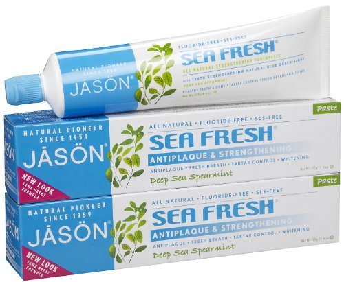 JASON Natural Cosmetics Sea Fresh Toothpaste, Deep Sea Spearmint, 6 OuncesPower up your smile with Sea Fresh all-natural sea-sourced toothpaste. Three natural whitening polishers; Bamboo Powder, Calcium Carbonate and Silica help prevent plaque build-up and are more gentle on your teeth than other whitening ingredients.Anti-bacterial Grapefruit Seed Extract and Perilla Seed Extract help block sugar acids and bacteria forming in your mouth. Certified Organic Aloe Vera Gel helps soothe and relieve gums from irritation. Essential oild of mint bring the Deepsea Spearmint flavor!Tooth decay destroys tooth enamel. Decay occurs when sugars and starches remain on the teeth and in the mouth. Oral bacteria thrive on sugar and starch, producing acids as they consume them, gradually destroying irreplaceable tooth enamel. Cavities are not, however, just kid's stuff. Recession of the gums combined with increased incidence of gum disease (which commonly occurs in adult mouths) may expose the roots of teeth to plaque and later decay. Brushing properly twice a day and daily c