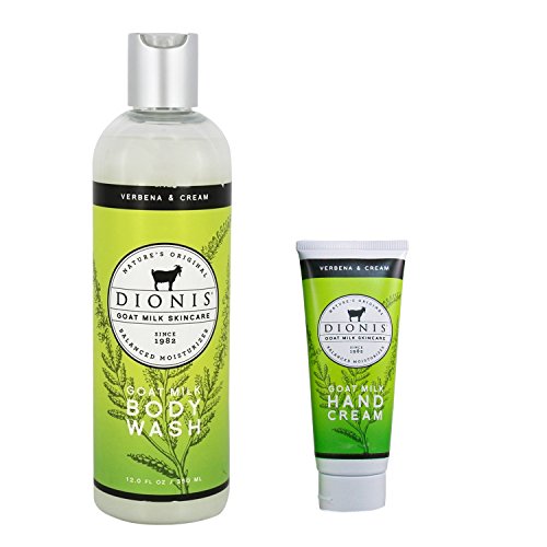 Dionis Goat Milk skincare gift set that includes one 12-ounce Body Wash and one 1-ounce Hand Cream in "Verbena & Cream" scent.