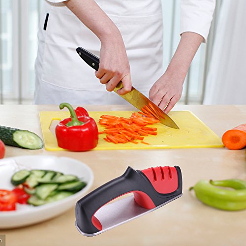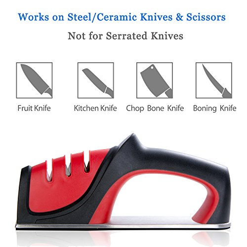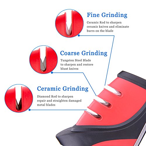 Sharpening in Seconds: Simply draw the knife through each slot a few times to achieve a razor-sharp edge. Stage 1-begins the sharpening process with coarse-grinding which suit to dull knives. Stage 2-continues sharpening with plating rod sharpening, it's for ceramic knives. Stage 3-completes the process with an extra-fine grit, it's a necessary step to eliminate the burrs on the knife and polish it.