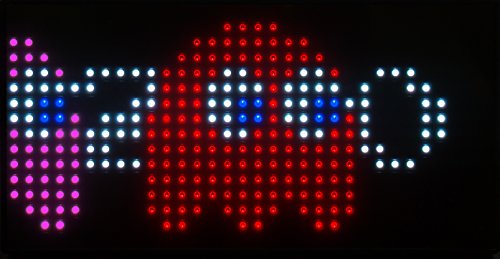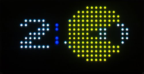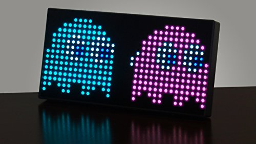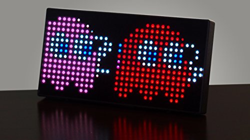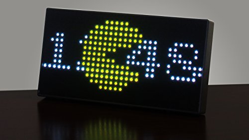 This limited-edition, handmade clock is made from a matrix of Jumbotron LED's, a high-quality optical-grade polycarbonate cover and sits in a sleek, low-profile shell. We took the large-format iconic LED display used in our hit game "PAC-MAN Chomp Mania" and engineered a more compact version, suitable for the home and office. This smaller version is very bright and features vivid color, but takes up a smaller footprint and has a much sleeker appearance. The resolution is the same as the arcade hit, but it fits nicely on the desk and makes a tasteful but bold statement of who you are.