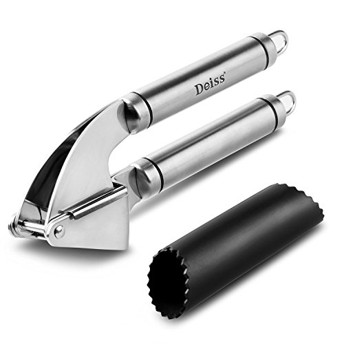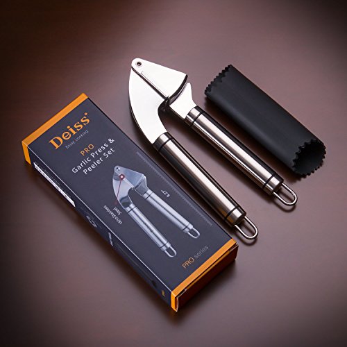 Deiss PRO Garlic Press and Silicone Garlic Peeler Set - Best Tool for Mincing Garlic and Ginger in seconds - Rust-proof stainless steel and extremely easy to clean - Dishwasher Safe
