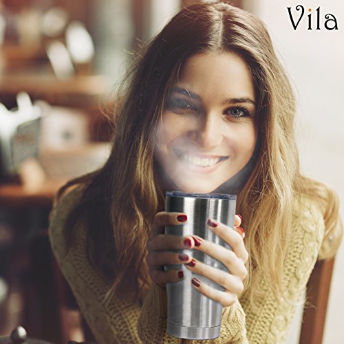 MAINTAINS TEMPERATURE OF BOTH HOT AND COLD LIQUIDS --- The innovative vacuum insulated, double wall tumbler keeps 30 ounces of hot liquids hot and cold beverages cold for many hours. Providing maximum ice retention, the stainless steel travel mug from Vila keep ice frozen twice as long as plastic cups. A unique "no sweat" design prevents condensation from forming on the outside of the tumbler keeping your hands dry and a secure grip.