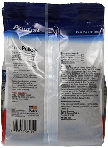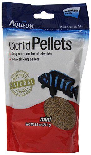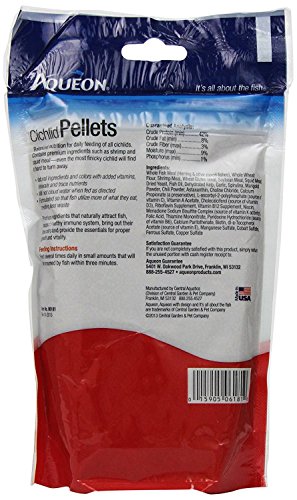-. Binding : Misc. -. Brand : Aqueon -. Feature : Will not cloud water / Formulated so that fish utilize more of what they eat, creating less waste / Resealable bag for freshness / Made in the USA / Aqueon Mini Pellet Cichlid Food -. Label : Aqueon -. Manufacturer : Aqueon -. Model : 6180-saParent -. MPN : 6180-saParent -. NumberOfItems : 1 -. PackageQuantity : 1 -. PartNumber : 6180-saParent -. ProductGroup : Pet Products -. ProductTypeName : PET_SUPPLIES -. Publisher : Aqueon -. Studio : Aqueon -. Title : Aqueon Cichlid Food Pellets