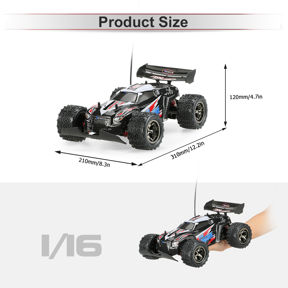 The high speed RC car is 1/16 scale electric RTR. Comes with front-wheeled and rear-wheeled independent suspension, super abrasion resistant rubber tires, high performance shock absorber and professional steering. Besides, it also has full function: forward, backward, turn left, turn right. Put in the battery to charge the off-road car, and enjoy the fun!
