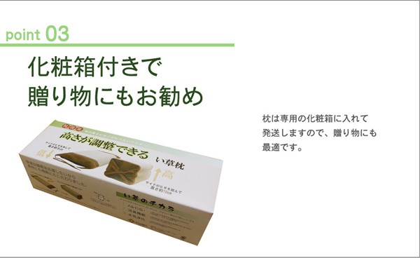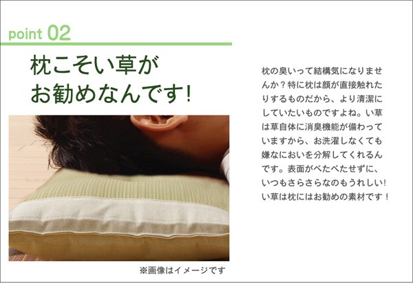 医師60名の意見・アイデアから快適な睡眠をサポートする「い草寝具シリーズ」を共同開発しました。長時間、肌に接する寝具だからこそ、自然素材を使い、やわらかな質感にこだわりました。快眠い草の効能として1.綿の3倍の吸湿力 2.蒸れにくい。汗による湿気を吸うことにより温度を下げ快適な就寝を促します。 3.汗のにおいを軽減。汗のにおいの元となる化学物質を90%以上抑えます。などがあります。染料、染土を使わない国産(九州産)のしなやかなイ草を使用していますので、柔らかく、すべすべとした肌触りです。い草に青森ヒバ加工を施しています(抗菌、防臭効果)。さらに中材にも国産い草チップをたっぷり使用しています。化粧箱入りでお届けしますので、贈り物にもぴったりです。