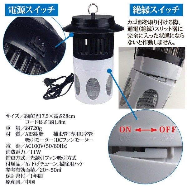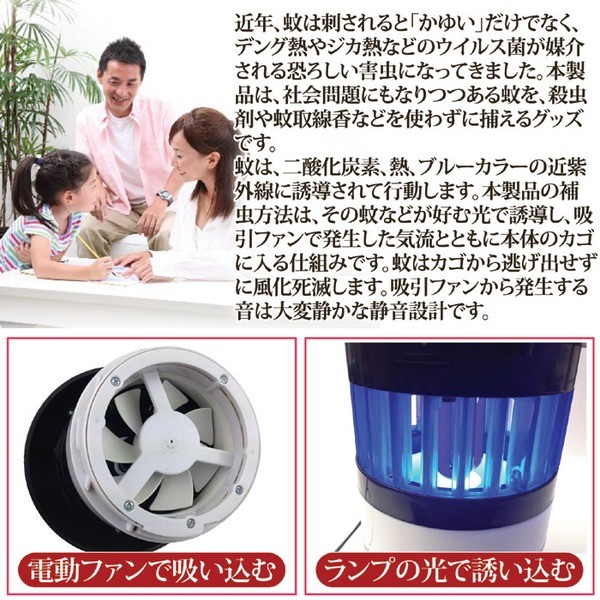 近年、蚊は刺されると「かゆい」だけでなく、デング熱やジカ熱などのウイルス菌が媒介される恐ろしい害虫になってきました。本製品は、社会問題にもなりつつある蚊を、殺虫剤や蚊取線香などを使わずに捕えるグッズです。蚊は、二酸化炭素、熱、ブルーカラーの近紫外線に誘導されて行動する虫です。本製品の補虫方法は、その蚊などが好む光で誘導し、吸引ファンで発生した気流とともに本体のカゴに入る仕組みです。蚊はカゴから逃げ出せずに風化死滅します。吸引ファンから発生する音は大変静かな静音設計です。カゴは簡単に取り外しできます。室内での使用以外に、軒下(雨のかからない場所)などに吊るしてもご使用いただけます。