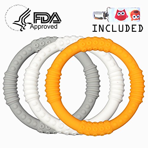-. Feature : BEST BABY TEETHER TOY: These teethers, with the SPES raised edge design, have an extremely high efficacy to reduce the pain and the discomfort of teething. They are designed for small hands for a perfect grip which help your baby to target and relieve the discomfort with ease! These are BPA Free teethers and they are also Phthalate Free, Lead Free, Latex Free and are FDA Approved. / VALUE PACK: 3x Teether - 100% Food-Grade Silicone • BOUNS: Included is a Pacifier clip with no extra charge. / IMPROVE MOTOR SKILLS • The circular design and the silicone softness help in the development of motor skills • Our circular design allow your baby to form a virtually perfect fist, allowing the continuous use of almost all the hand muscles. This allows your baby to practice these muscles and improve their motor skills throughout the teething process. / BRIGHT COLORS STIMULATE THE SENSES. Our teethers come in bright colors: Orange, White and Light Grey. Bright Colors have long been scientifically proven to stimulate the senses. Plus, they are loved by babies • You might have wondered why there always are bright colors in babies' play areas. / WEARABLE AS BRACELET • Our teethers are also wearable as bracelets for easy carry.