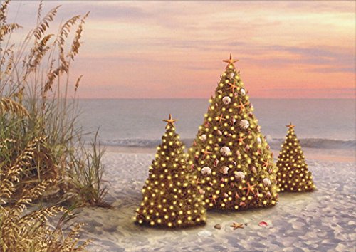 18 Christmas Cards and Embossed Envelopes, Decorated Trees on the Beach