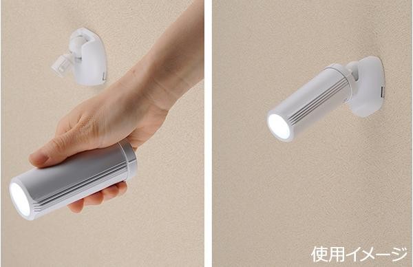 | 壁に取り付けてセンサーライトとして、緊急時には取り外して懐中ライトとしてお使いいただけます。センサーは、暗いところで人を感知するWセンサー仕様(光+人感一体型)です。本体をフレキシブルに可動でき、感知方向に向けられます。センサーオンのスタンバイ状態のときは、赤色LEDが点滅します。懐中ライト使用時は、プッシュスイッチをオンにして常時点灯できます。防水仕様なので、屋外での使用も可能です。 |