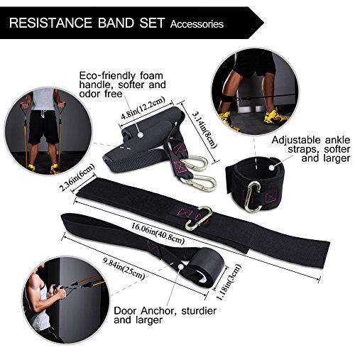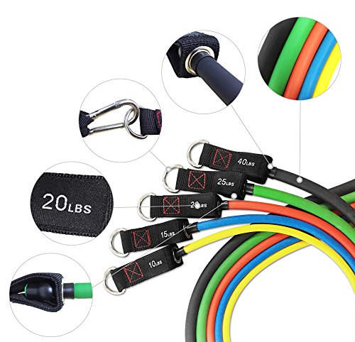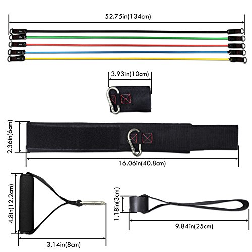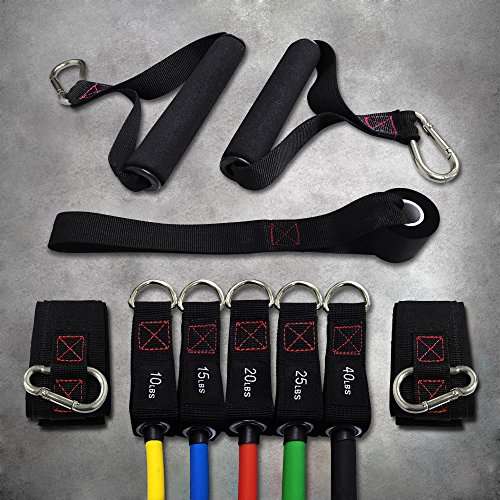 5 x Anti-snap latex bands ·Yellow band = 10 lbs ·Blue band = 15 lbs ·Green band = 20 lbs ·Black band = 25 lbs ·Red band = 40 lbs 2 x Sweatproof cushioned handles 2 x Ankle straps 1 x Door anchor 1 x Waterproof Carry Bag 1 x Instruction