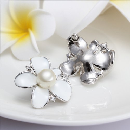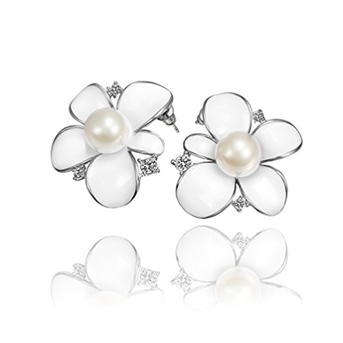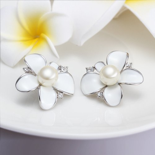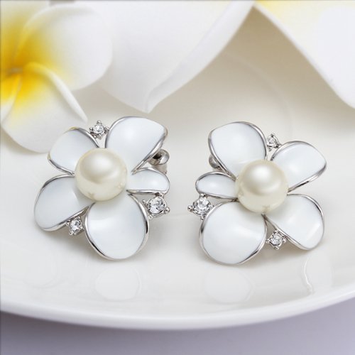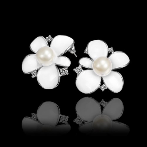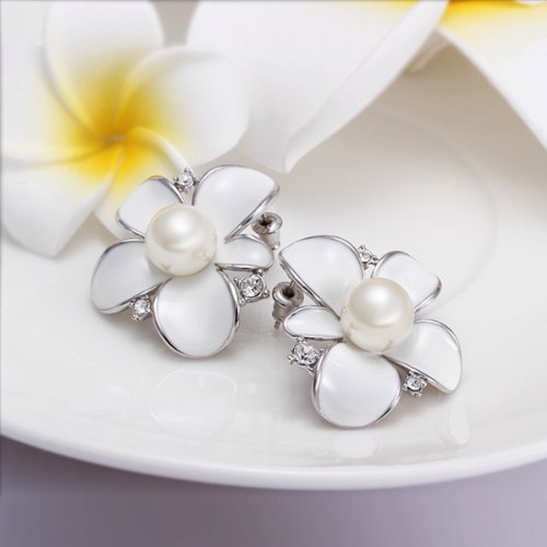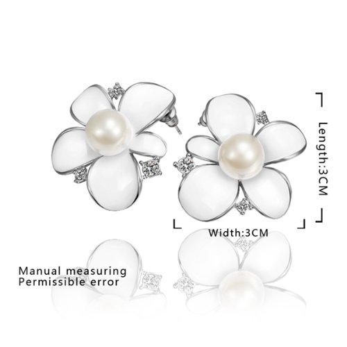 -. Title : DUMAN 18K White Gold Plated Earrings White Enamel Pearl Flower Crystal Stud Earrings Health Jewelry