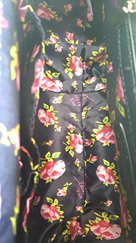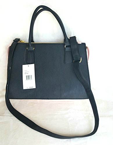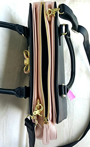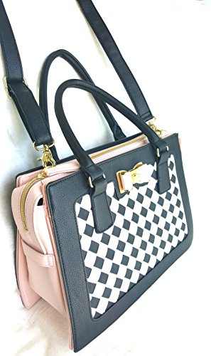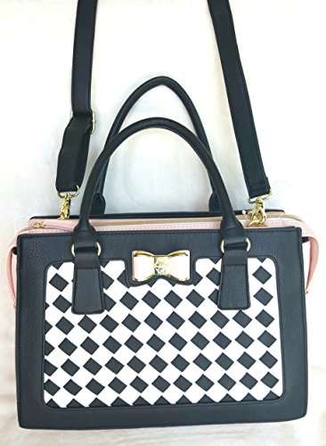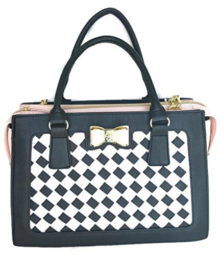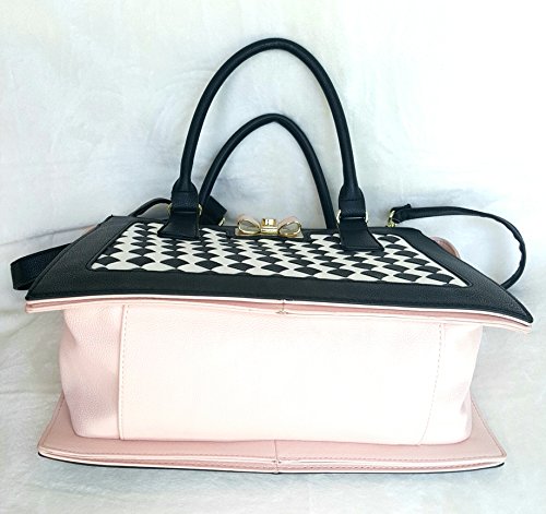 Overall Faux Leather Body. Front panel is woven lattice of Black/White. Blush Color Sides & Base. Triple compartment bag: 2 distinct compartments, 1 Center zipper compartment having Side wall zip pocket & 2 tech drop pockets. Blush & Gold tone hardware Bow logo. Dual handles with 6" drop. Removable/adjustable crossbody strap with 25" drop approx Platform bottom Fully lined in Signature Polyester Floral print. Bag MEASURES: 9.75"(h) x 14"(L) x 5.5"(d)