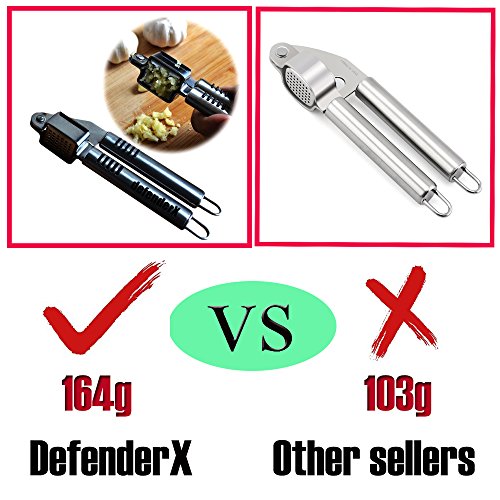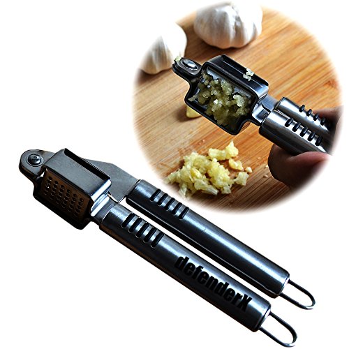 DefenderX Premium Kitchen Stainless Steel Garlic Press Ginger Press Crusher Here are 5 Reasons You're Going to LOVE Your defenderX Garlic Press: 1. It easily minces garlic in one press (No more sore palms or aching fingers like you get with other garlic presses) 2. Large capacity basket (Press good sized cloves ... even if you leave the peels on) 3. No more stinky "garlic hands" (Easy to use and even easier to clean so you won't have to worry about smelling like garlic cloves all day) 4. Heavy duty, quality construction (BUT it weighs in at a svelte 9.3 oz so ANYONE can use it effortlessly) 5. Backed by a LIFETIME Guarantee! (Order yours now because you literally RISK NOTHING!) Order your own defenderX Garlic Press today. Use it in your kitchen to effortlessly press garlic and add loads of flavor to your favorite dishes. Once you've seen for yourself how handsome is the defenderX Garlic Press, how easy it is to use, how quickly you can clean it, we're confident you'll have LOADS MORE than 5 reasons to love it! Imagine... you could be enjoying the robust flavor of minced garlic in all of your favorite dishes - spaghetti, lasagna, risotto, and so much more! All you need to do is click the button at the top of this page to have your very own defenderX Garlic Press rushed straight to your door. Why wait till your current garlic presser finally breaks down. Haven't you put up with enough inconvenience? Order your defenderX Garlic Press and join thousands of other satisfied customers who LOVE the defenderX difference!