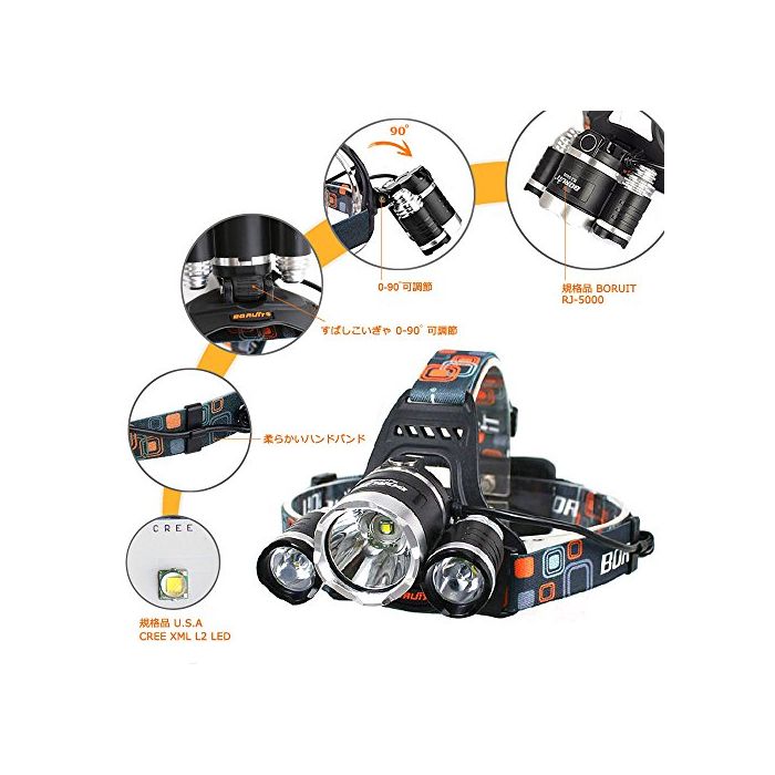 원본상품명:超高輝度LEDヘッドライトBoruit RJ-5000 3? XM-L L2 LED 超?力5800LM 充電式 IPX65 防水仕? ヘッドライト 角度調節可能 登山 夜の作業 夜釣り アウトド