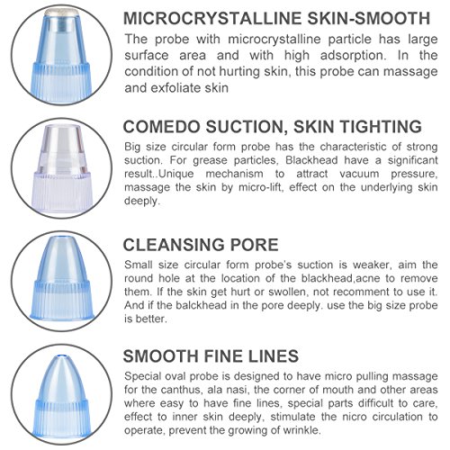 - Multi-functional beauty instrument, set exfoliating, firming,removing blackhead,pore cleansing in one. 5 levels suction intensity for different needs.With 4 optional suction heads: Microcrystalline head, Large size circular form probe, Small size circular form probe, Special oval head.