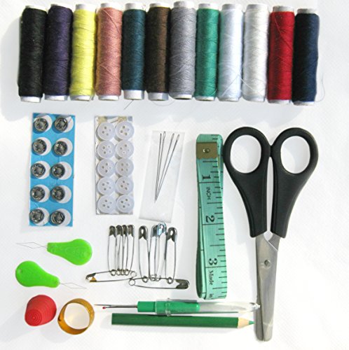 - Feature : We All Know That the Scissors Make the Difference in Any Sewing Kit. Our Small Scissors Perform Equally Well as other Top Quality Larger Scissors. / Great as a Beginners Sewing Kit. Why Should A Beginner Have to Learn Using Low Quality Sewing Accessories. Get Them Started With a Quality Set. / This is the Perfect Kit For Use at Home When You Only Have a Small Repair to Make, or to Bring Along on Your Family Vacations. It is also Great for the College Student in Your Family. / Includes 12 Thread Spools, 4 Needles, 1 Seam Ripper, 1 Scissors, 1 Measuring Tape, 2 Threaders, 10 Buttons, 1 Pencil, 2 Thimbles, 10 Safety Pins & 10 Nickel Sew-On Snaps / Long lasting, zippered, heavy duty 600 D Polyester case with plenty of room to add more supplies if needed. A Great Sewing Basket Alternative. It also comes with a Handy Carry Strap.