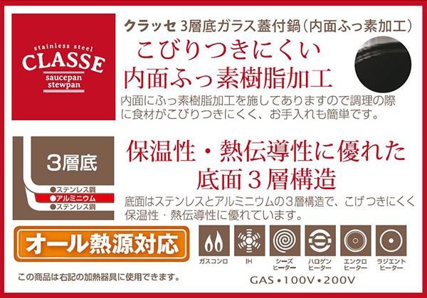 | 素材・材質 | 【本体】 表面加工/内面:ふっ素樹脂塗膜加工 材料の種類/本体:ステンレス鋼(クロム14%)、はり底:アルミニウム合金、ステンレス鋼(クロム11%) 【蓋】 品名/強化ガラス製器具 強化の種類/全面物理強化 その他の材料/縁リング:ステンレス鋼、つまみ・座板:フェノール樹脂(耐熱温度150度) |