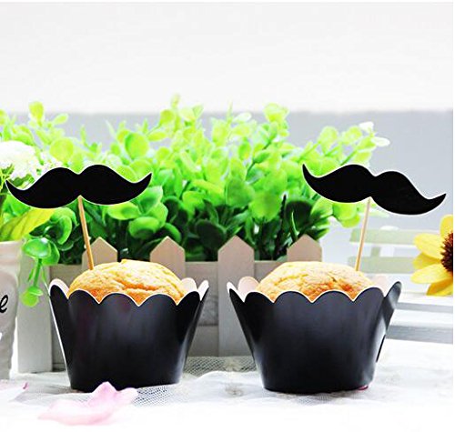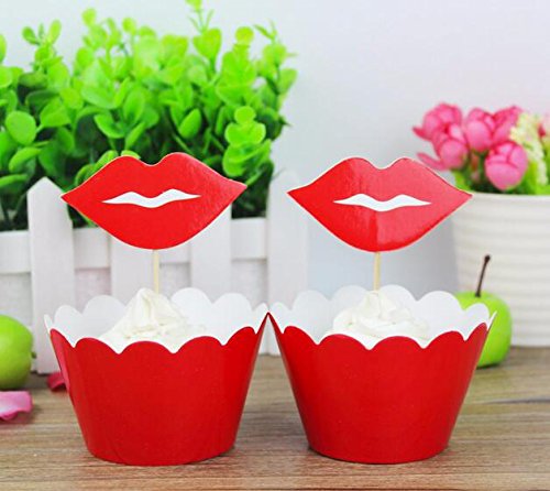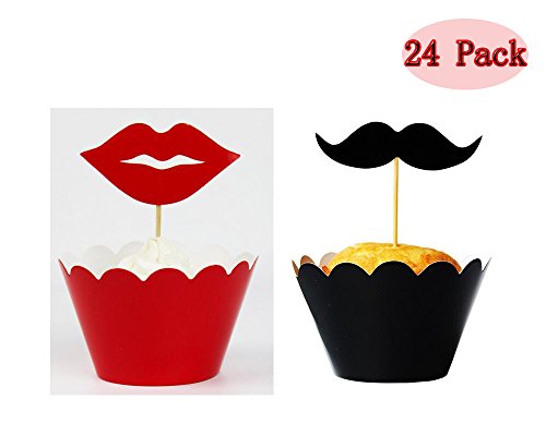 (Set of 24)Mr & Ms Fun Cupcake Topper Series,4pcs Mustache+ 24pcs Red lips Cupcake Topper and Cupcake Wrappers with Picks
