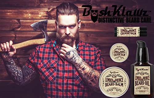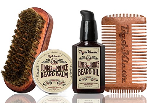 BushKlawz Full Size 2 oz Lumber Prince Premium Scented Beard Balm Leave-In Conditioner, 2 oz full size Scented Conditioning Beard Oil, with our signature anti-static wooden 4Klawz Pocket Beard Comb and 100% natural BoarKlawz Boar Beard Brush as a great beard care kit.