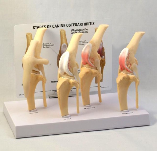 骨関節炎は日本で10頭のうち1頭が患っているといわれる病気です。この模型は健康な膝の関節模型・早期・中等症・進行性を色々な角度から見られます。