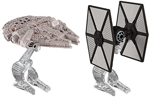 -. Binding : Toy -. Brand : Hot Wheels -. EAN : 0651046833314 -. Feature : Launch into hyperdrive with a pair of iconic vehicles from Star WarsTM, brought to you by Hot Wheels®. / Kids will love re-creating some of the universe's most epic battles and fiercest showdowns with this 2-pack of starships / Slip on the Flight NavigatorTM, raise your hand and send your ships "flying" across the room-just like in hyperspace! / The Flight NavigatorTM also doubles as a display stand to show off a collection. / Great gift for Star Wars and Hot Wheels fans -. IsAdultProduct : 0 -. Label : Hot Wheels -. Manufacturer : Hot Wheels -. ProductGroup : Toy -. ProductTypeName : TOYS_AND_GAMES -. Publisher : Hot Wheels -. Studio : Hot Wheels -. Title : Hot Wheels Star Wars Spaceships 2 Pack Tie Fighter vs Millennium Falcon Diecast Includes Fight Navigator -. UPC : 651046833314