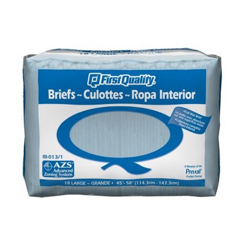 Studio : First Quality Publisher : First Quality Product Description First Quality®Incontinent Brief is 45 to 58 Inch Waist / Hip Large.Easy-Lock Fastener® (ELF®) Reattaching fasteners securely grip and hold without being stick.Maximized breathable zones.Targeted acquisition zone with blue stay-dry strip.Fecal Containment zone.Easy-Lock Fasteners grip and hold without being sticky. Sold in case of 72 briefs. First Quality Incontinent Brief Absorbent Capacity: Moderate Absorbency Backing Material: Poly Backing Color: Blue Fastener Type: Refastenable Tabs Gender: Unisex Leg Style: Elastic Gathers Size: Large Sizing Range: 45 to 58 Inch Waist / Hip Style: Tab Closure Topsheet Material :Cloth-Like Topsheet Type: Mat Body Shape Usage :Disposable User: Adult,85-554728 0