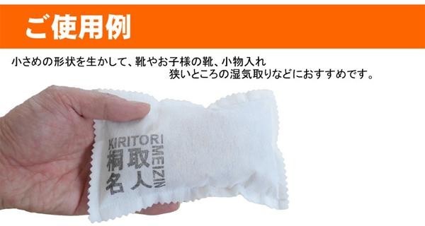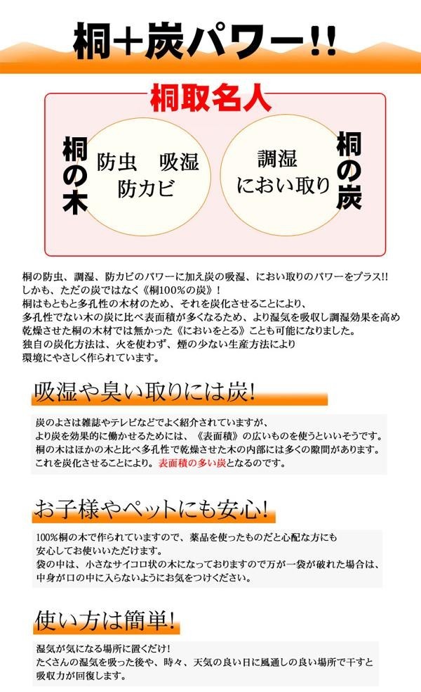 桐の木と桐の炭を混ぜた天然素材でできた安心の吸臭・吸湿剤です。小さめの形状を生かして、靴や小物入れ、狭い所の湿気取りにおすすめです。