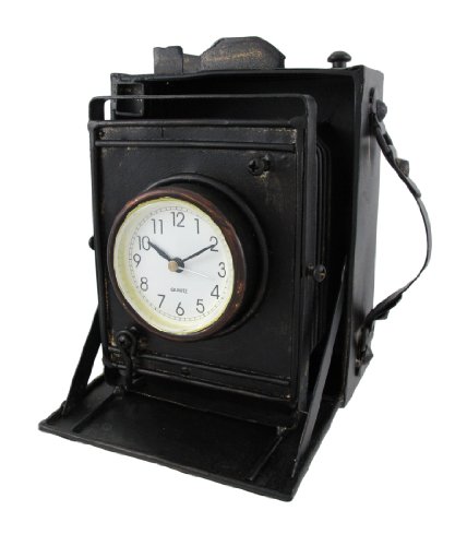 This reproduction retro camera clock adds a unique accent to bookshelves, mantels, and more! Made of metal, it measures 6 1/4 inches tall, 5 3/4 inches wide, and 4 1/2 inches deep. The clock face measures 2 1/4 inches in diameter, features quartz movement, and runs on 1 LR44 button cell battery (not included.) It makes a great gift for shutterbugs! NOTE: To install a battery and set the time, remove the clock face by grabbing the metal rim around it and pull it straight out.