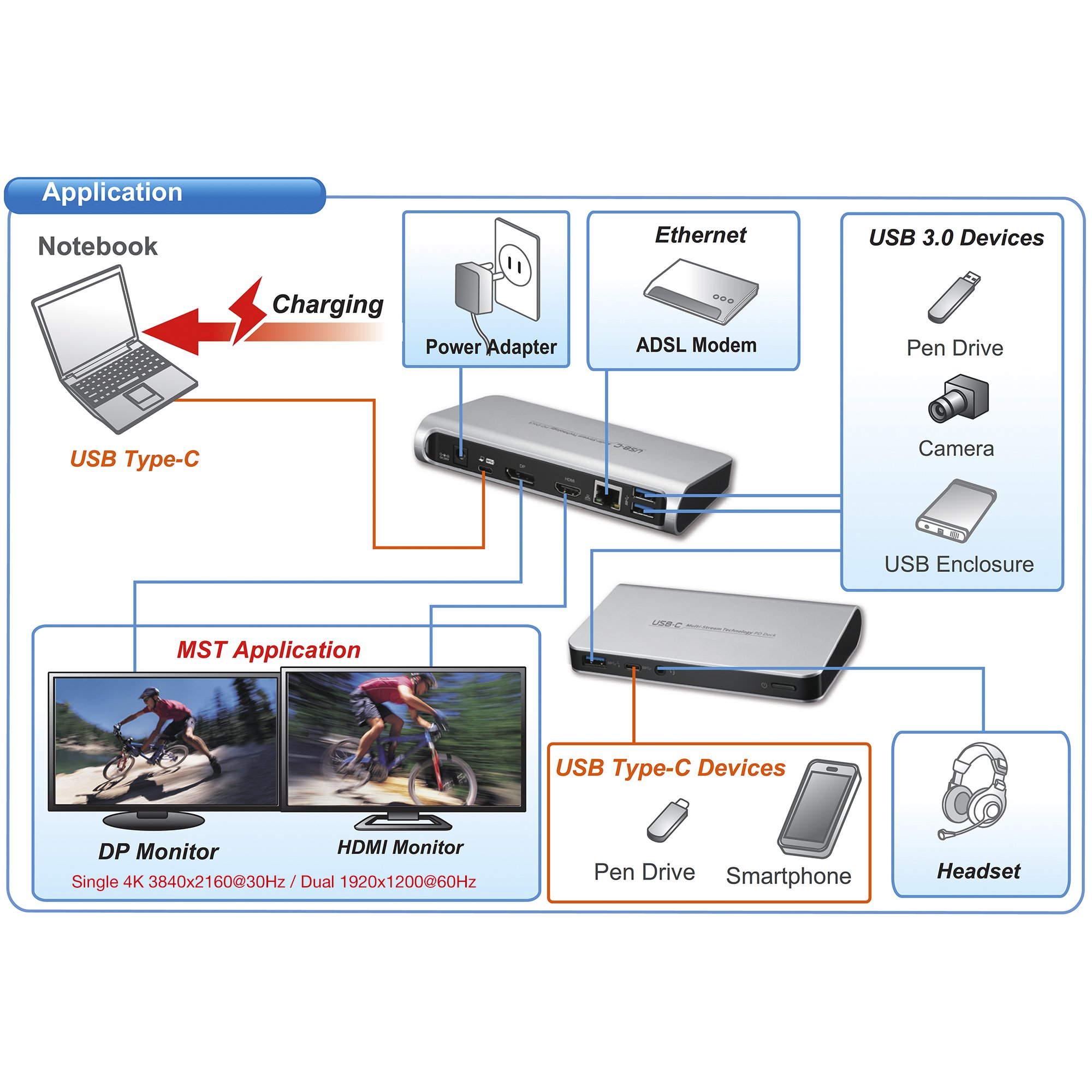 It adopts PD charging technology and charges connected PC by upstream charging function via USB - C interface.