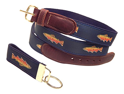 -. Feature : Ribbon has a repeating pattern of a single rainbow trout, on a navy blue background, and is stitched into a 1 1/4 inch wide, navy, cotton web backing / Leather tabs / Brass buckle / Available in sizes 30 to 50 . . . All sizes kept in stock, for easy exchange, if necessary. / MADE IN THE USA!