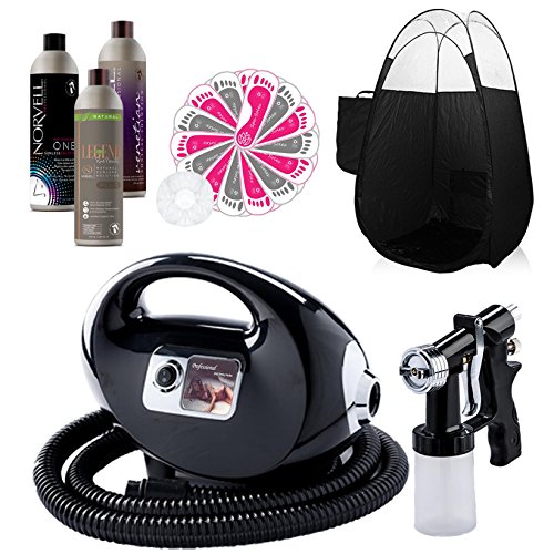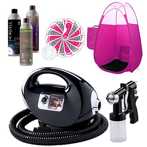 Bundle includes: Black Fascination FX Spray Tanning System with spray gun and hose, Venetian Spray Tanning Solution; ONE 1 Hour Spray Tan Solution; Norvell Legend Plus Natural Spray Tan Solution, feet protectors, hair caps and a "SkyLight" design tent with carrying bag.