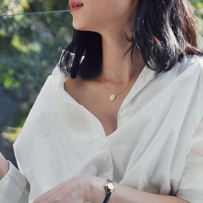 특별히 애정하는 코인 팬던트에 다이아 이니셜 세팅. 언제나 과하지 않지만, 부족하지도 않게. 무광팬던트에 다이아 세팅은 골드와 다이아, 두 보석이 서로 더 빛나게 해주기에 충분했어요. 어떤 코디에도 다 잘어울렸던 제품이라 촬영 날 코디 고르기가 더 어려웠던게 기억나요.