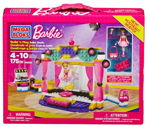 Barbie has a big recital only a few days away and she'll need your help to practice in her Mega Bloks Barbie Build 'n Play Ballet Studio. Build and decorate her Ballet Studio any way you want, then help Barbie put on her make-up in front of the vanity mirror, choose her ballerina style between two beautiful tutus, then put on the finishing touches with her glamtastic princess tiara! Stand her on the ballet spinner at center stage and turn her round and round just like a real ballerina! With your help, Barbie is sure to put on a ballet recital nobody will ever forget! Combine your Ballet Studio with other Mega Bloks Barbie sets to build the Barbie world you imagine! Ideal for ages 4-10.