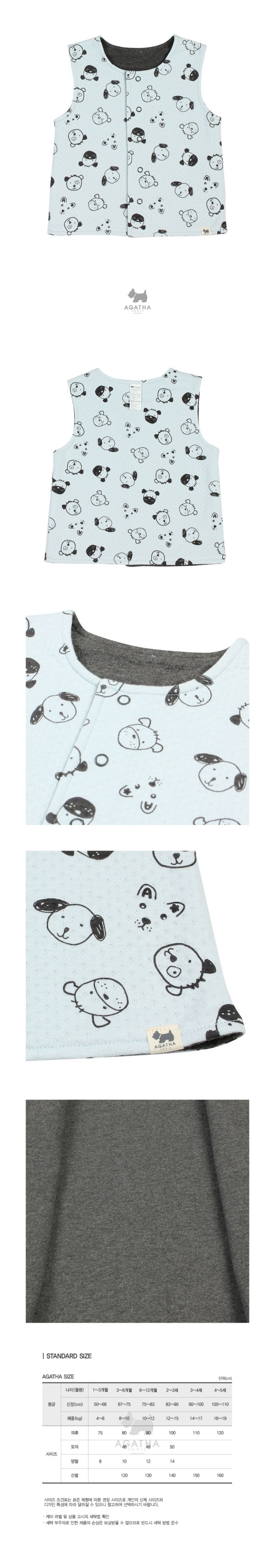 강아지 프린트의 삼중지 소재를 사용하여 보온성을 높여준 수면조끼입니다.(80/90겸용 100/110 겸용)