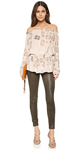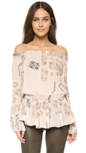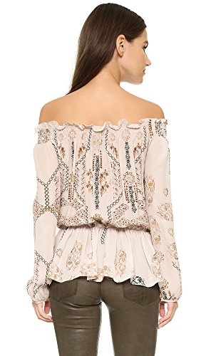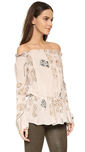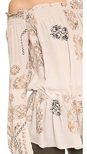 A painterly print lends an eclectic touch to this breezy Rory Beca blouse. Smocked elastic cinches the ruffled neckline and gathers the loose hem. Long blouson sleeves.