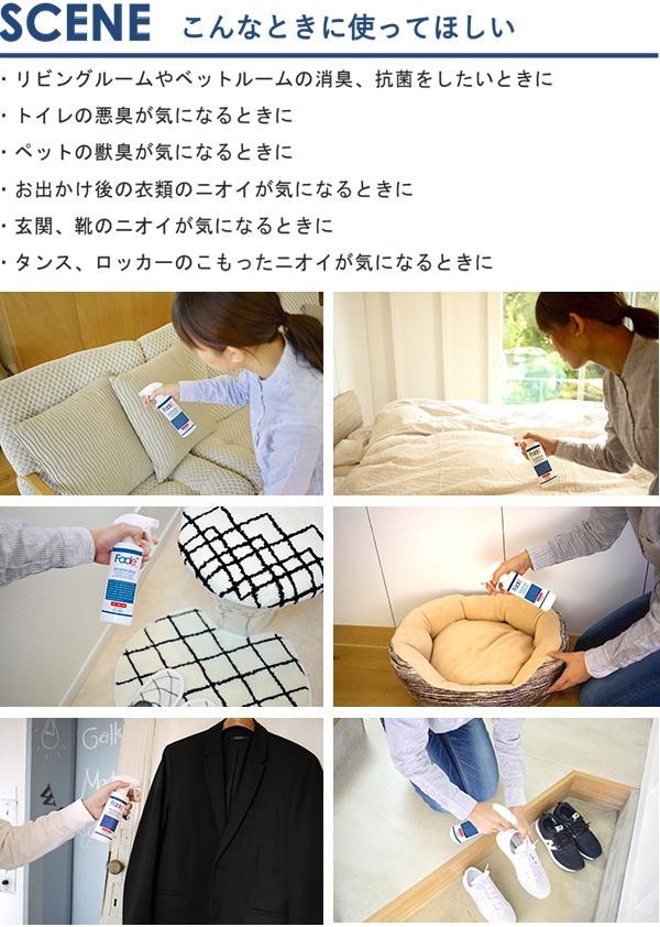 Fade+は 日本で開発された人工酵素を使用した消臭・除菌・抗菌スプレーですフルーツや草木など天然の香りはそのままに 悪臭のみに力を発揮します