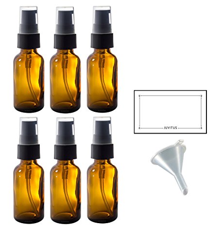 1 oz Amber Glass Boston Round Treatment Pump Bottle (6 pack) + Funnel and Labels for essential oils, aromatherapy, food grade, bpa free