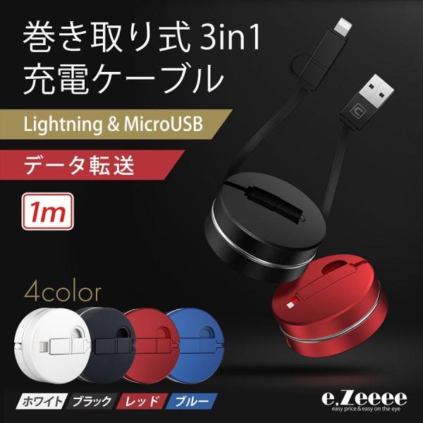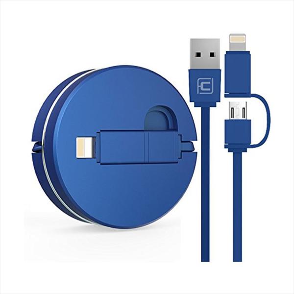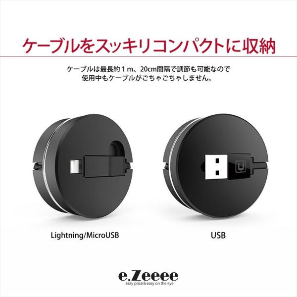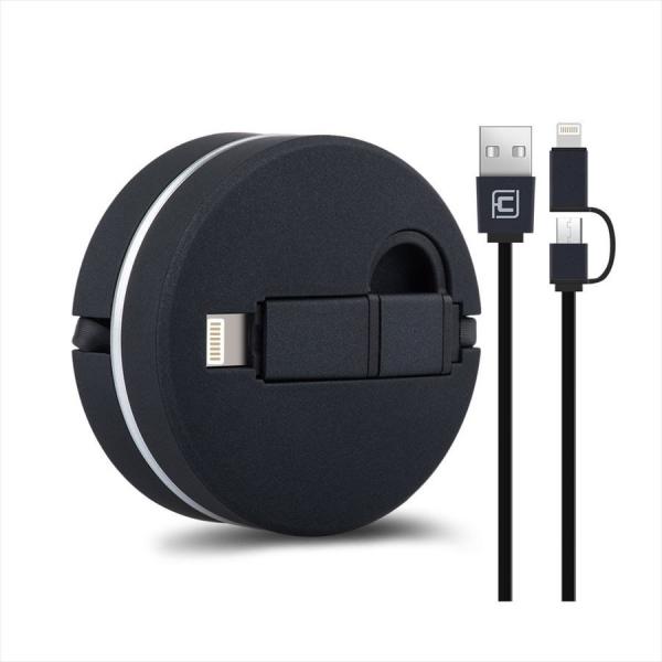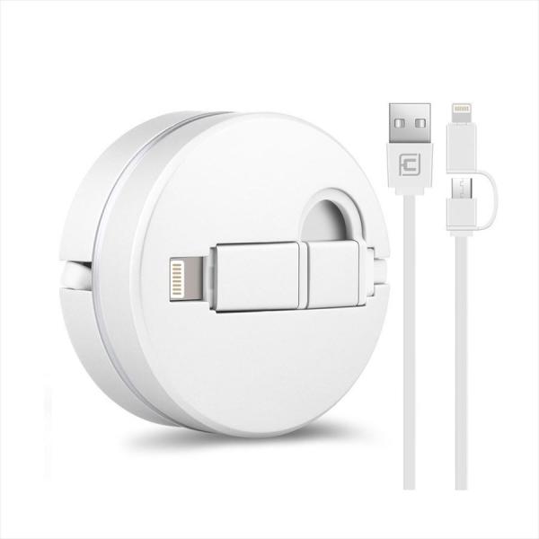2in1 急速充電 データ転送ケーブル (2.4A出力対応)・コネクタ:Lightning/micro USB⇔USB・ケーブル形状:巻き取り式(フラット)・ケーブル長:約1m2in1 巻取り充電ケーブル Lightning & microUSB 1mです。=対応機種=iPhoneX/iPhone8/iPhone7/iPhone6/GALAXY/AQUOS/Xpeia等 巻き取り式のオシャレなケーブルです。これ1本あればiPhoneもAndroidも充電ができ大変便利です。・本体の直径:5cm・本体の高さ:2cm・ケースの直径:7.5cm・ケースの高さ:3.2cmカラー:ブラック ホワイト レッド ブルー専用ケースももれなくプレゼント!!